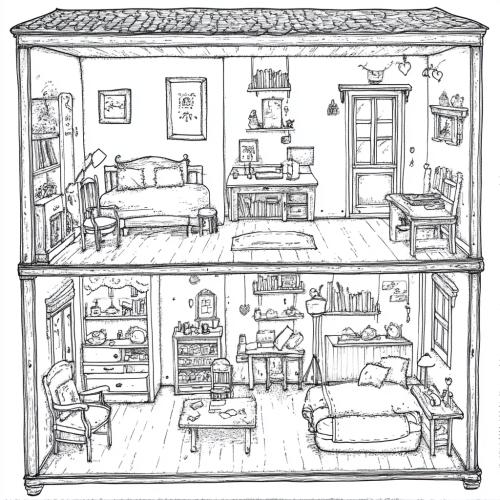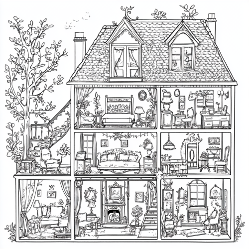 A detailed adult coloring page featuring a dollhouse theme, showing an intricately designed dollhouse with multiple rooms, each filled with miniature furniture, decor, and tiny objects like chairs, tables, lamps, books, and potted plants. The design should have a moderate level of complexity, with fine details such as patterns on curtains, textures on walls, and small decorative items scattered around the rooms. The overall composition should be charming and whimsical, with clean lines and balanced elements to create an engaging and relaxing coloring experience.