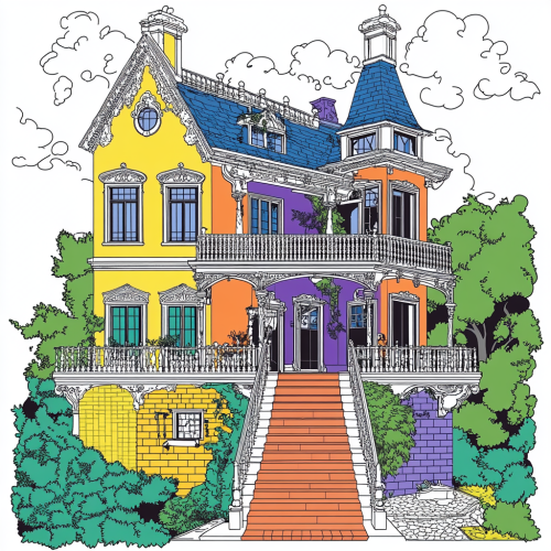 An intricate and beautifully colored doll house, originally a black and white coloring page, now filled with a vibrant and harmonious color palette. coloring page for adults. doll house,The angle of view is the image from diagonally above the right, in the style of thick lines. --v 6.1