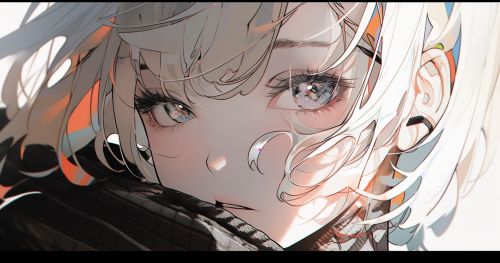 an anime girl with expressionless face, upper body, low angle, subject is skewed to the right side of the screen, white-gray blurred background, dizzy --ar 17:9 --niji
