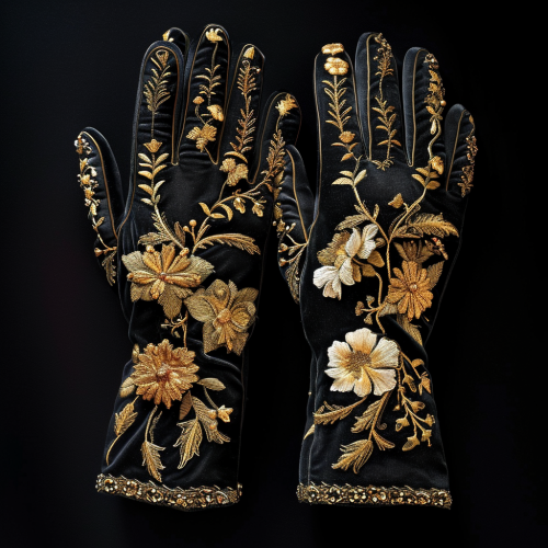 Black gloves, high-angle photo, embroidered golden, flowers illustration, many details, black background --v 6.0