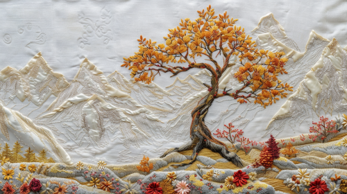 embroidered artwork, embroidered mountains, embroidered sky, embroidered flowers, embroidered giant tree of life, cinematographic scene, white background, golden details, depth of view, golden style, color in golden and white --ar 16:9 --v 6.0