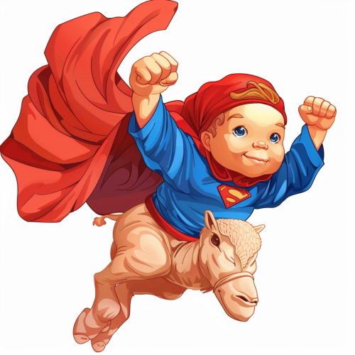 a half baby camel, half baby human superhero flying superman style with one fist forward, cartoon, white background --v 6.0