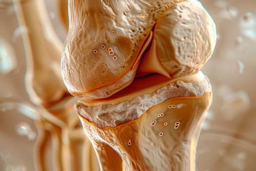 Medical illustration of a knee joint with deposits of calcium pyrophosphate crystals, clear labeling of the cartilage and inflammation, realistic anatomical detail, bright and educational style --v 6.0 --style raw --ar 3:2