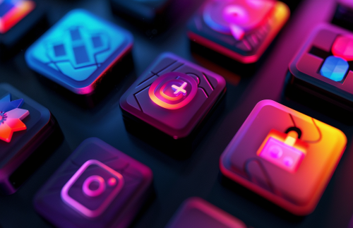 abstract 3D fractals that are mixed around with a gradient to them, this gradient is made up of the colors of the logo of the Instagram app, add a speed effect to each with a blur, make sure the colors are mixed together well, add other shapes in there with the same gradient colors, 16k --ar 17:11 --v 6.0 --s 50