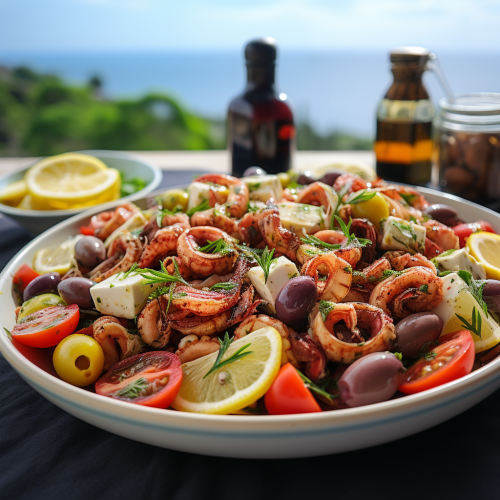 "Realistic high-quality close-up of a beautifully plated dish of [nome della ricetta], captured in natural lighting. The dish is presented on a rustic wooden table with subtle, fresh ingredients scattered around as garnish. The food is warm, fresh, and inviting, with visible textures and vibrant colors. The setting includes small touches, like a folded napkin, silver cutlery, and a glass of water in the background, giving the scene a cozy, appetizing feel." Salade de pois chiches : 150 g de pois chiches, 50 g de concombre, 50 g d’avocat et 20 g de feta, le tout arrosé d'une vinaigrette à l'huile d'olive. --ar 16:9