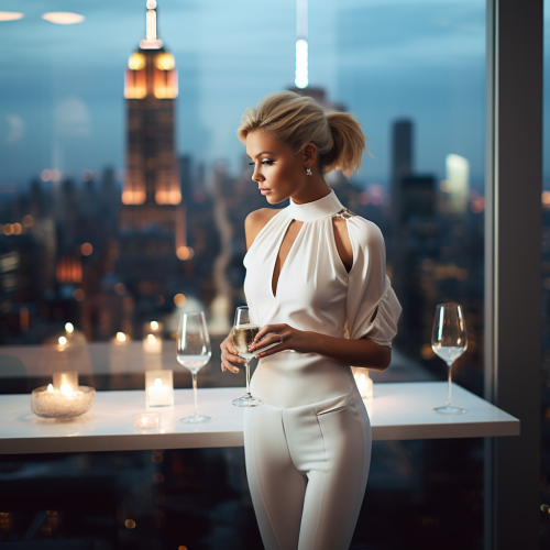 a blonde woman standing, dressed in white on top of a table in a club room, in 230 Fifth Ave rooftop, Manhattan, NYC, in the evening --style raw