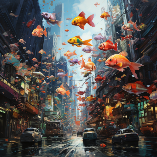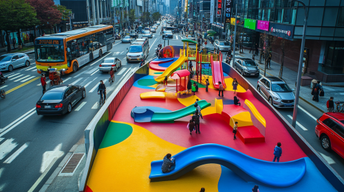 In the middle of a busy city street of Seoul, surrounded by moving cars, buses, and pedestrians, stands a vibrant, colorful playground right on the road. The playground is unexpectedly placed in the heart of traffic, with bright colors like red, yellow, blue, and green, creating a stark contrast against the surrounding gray and black vehicles and buildings. People and drivers look on with curiosity and surprise as they pass by, the playground standing as a surreal, playful centerpiece in the midst of an otherwise hectic, monochromatic urban environment. --ar 16:9
