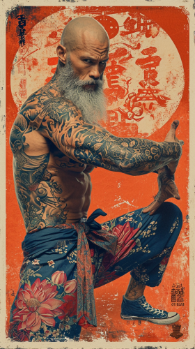 Colorful Japanese retro poster, a 45-year-old bald bearded handsome man is stretching his body, print, extraordinary expression, proud, wearing converse on his feet, covered with traditional Japanese tattoo designs, thin tattoos, strong sense of contrast, mix of avant-garde art Body --ar 9:16 --stylize 750 --v 6.0