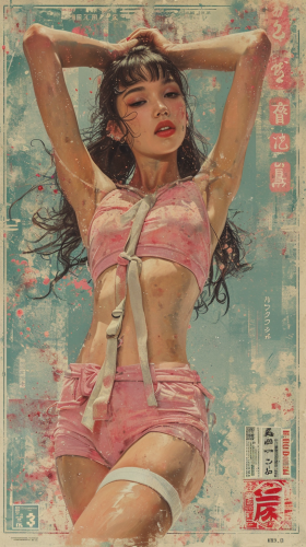 Colorful Japanese retro poster, a young 18-year-old slender pretty girl is stretching his body, print, extraordinary expression, proud, wearing white socks on his feet, strong sense of contrast, mix of avant-garde art Body, pink color tone, 16K --ar 9:16 --stylize 750 --v 6.0