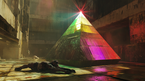 A big and free-floating platform in a cyberpunk industrial area. A dead cyborg ape is lying on the platform. There is also a crystal pyramid prism object. The prism is emitting rays of colored light from the center of it. --ar 16:9 --v 6.1