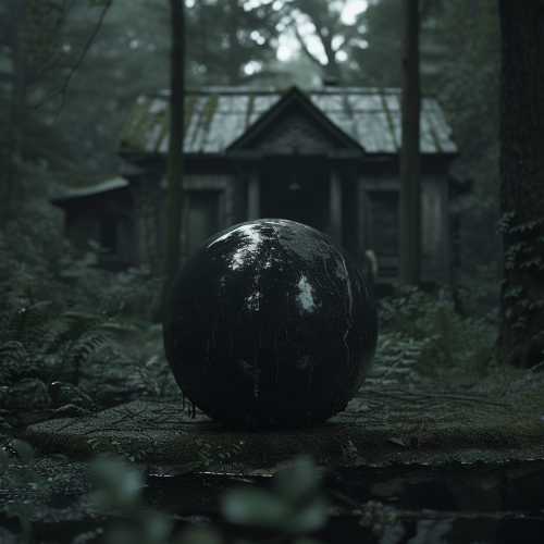 photo, dark realism, abandoned old house in the forest, upon it a black, hyperdetailed liquid, sphere, cinematic, aesthetic emphasis, --style raw --v 6.0
