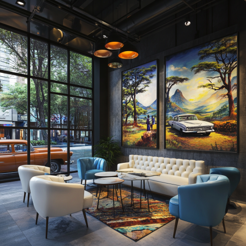 coffee shop in a minimalist style, the floor walls are made of steel, multi-colored lighting, comfortable sofas and tables in white and blue leather, paintings on the walls depicting Africa around forests and mountains, floor-to-ceiling glass windows, view of the coffee shop from the street, there is a beautiful retro car next to the coffee shop
