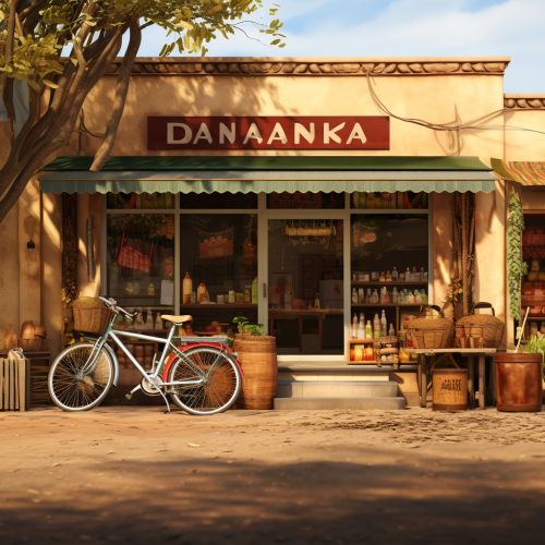 ultra realistic indian theme wine shop in middle of nowhere close up shot of shop. add a banner on top of shop with text 'DAWAKHANA'