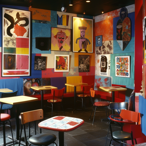 magazine photograph, 1990s Memphis design style restaurant opening --style raw --v 6.0