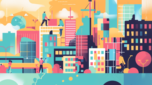 Colorful, Corporate Memphis style depiction of a cityscape with imaginative building designs, characters actively participating in innovative construction processes, representing a breakthrough in overcoming traditional construction barriers --ar 16:9 --v 6.0 --style raw --s 50