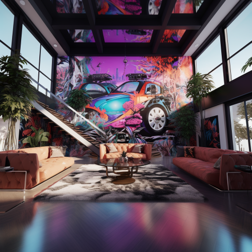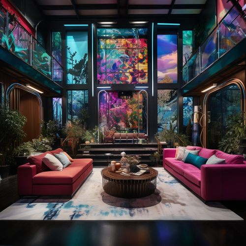 **a highly realistic photograph of a living space with an immersive video wall covering the entire space for an interactive singing competion show set in a los angeles mansion. Big brother style, Modern, MTV TRL STYLE. Highly detailed, highly realistic. Pop futurism, Memphis design. Sony PXW-Z450 --s 50