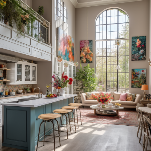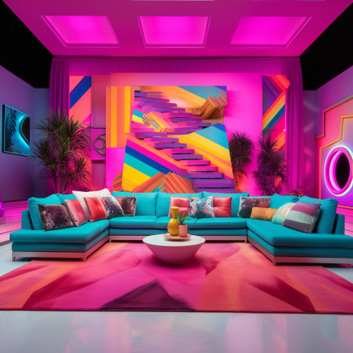 **a highly realistic photograph of set design of a living room with LED walls for an interactive singing competion show set in a los angeles mansion. Modern, colourful, MTV TRL STYLE. Highly detailed, highly realistic. Pop futurism, Memphis design. Sony PXW-Z450 --s 50