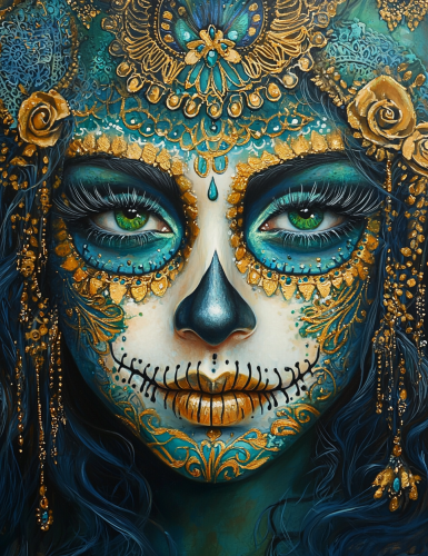 Day of the dead catrina portrait, green, gold and blue, intricate details, looking straight on, creative face painting, surreal, photorealistic, natural outdoor light, --ar 2588:3375 --q 2 --v 6.1