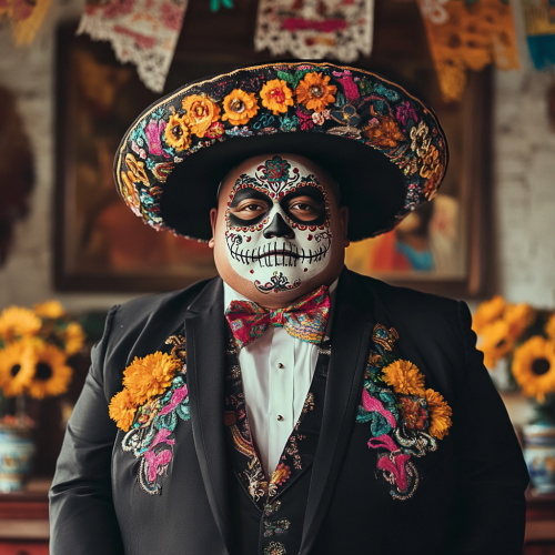 A sumo wrestler dressed as a Mexican ‘catrÃn,’ blending traditional sumo attire with classic Mexican catrÃn elegance. He wears a black suit with intricate embroidery, a colorful bow tie, and a decorative wide-brimmed hat adorned with Day of the Dead motifs. His face is painted in the style of a sugar skull, with vibrant colors and floral patterns. The background has a festive Mexican ambiance, with marigold flowers and papel picado banners. The lighting is dramatic, highlighting the contrast between his imposing physique and his elegant attire