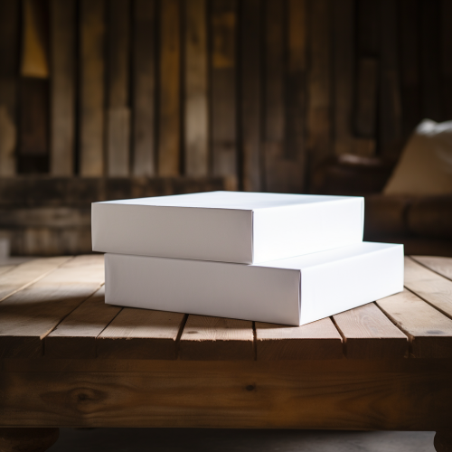 2 clamshell white boxes ontop of a wood table stacked, photographic