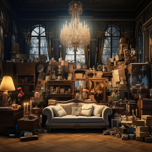different angles of a french luxurious mansion storehouse ,sofa and table , curtain, chandelier, Many same storehouse cardboard boxes neatly stacked in the luxurious living room,night,bright, photorealistic,maximalism --v 5.2