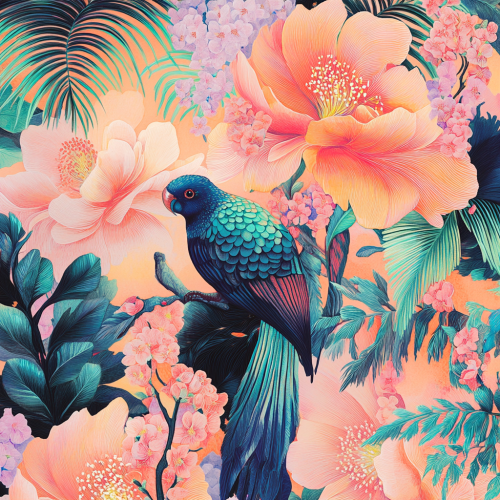 Illustrate a fantastical garden filled with oversized, detailed blooms and colorful paradise birds. The birds’ feathers should be adorned with intricate patterns, with the flowers glowing in soft pastels and rich, tropical tones. The overall design should evoke a dreamlike, otherworldly beauty.