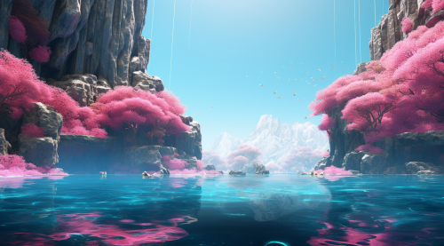 floating blue lake with an underwater waterfall and a lot of pink stones,the island is very colorful and surrounded, in the style of matt molloy, bold typography, rebeca saray, album covers, elba damast, vibrant, high-energy imagery, daz3d --ar 128:71