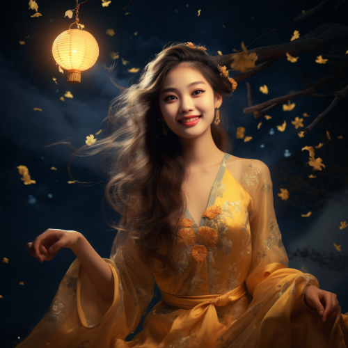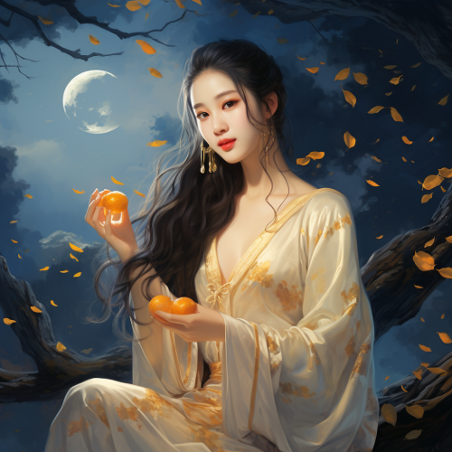 a beautiful chinese girl floating on the night sky, windy, osmanthus tree and huge moon in the background, Liu Yifei, portrait, smile, paradise, holding a mooncake
