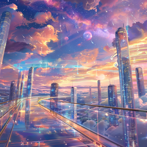 the following background for a scenario: The aesthetic is represented by a futuristic cosmos sky paradise, decorated with rich textures and soft colors creating a dreamy atmosphere