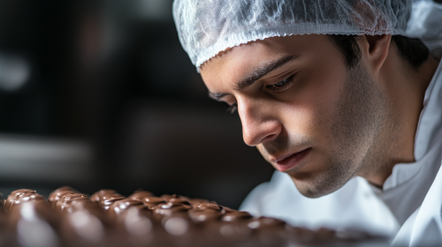A dramatic and stylish image of melting chocolate flowing smoothly, paired with cacao beans. The scene captures the richness and allure of the chocolate, with a glossy, reflective surface that highlights its creamy texture. Cacao beans are prominently featured, symbolizing the raw and natural origins of the chocolate. The composition is dramatic, with a play of light and shadows to create a captivating and elegant atmosphere, emphasizing both the luxurious quality of the chocolate and the rustic, organic feel of the cacao beans