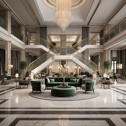 contemporary boutique hotel style bedroom. dark green velvet modern headboard. herringbone wood floor. Marble, gold. Wall lights.