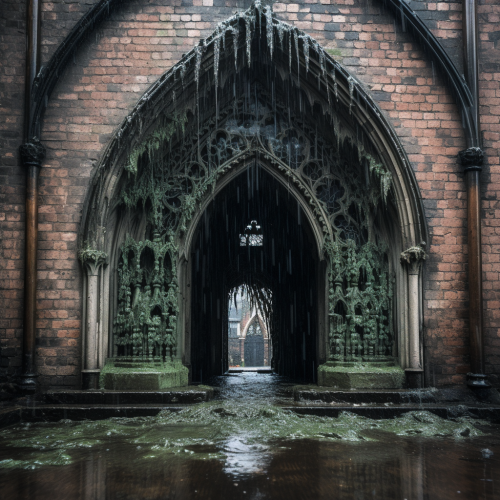 gothic church doorway dripping with slime oozing out from between bricks, overcast weather