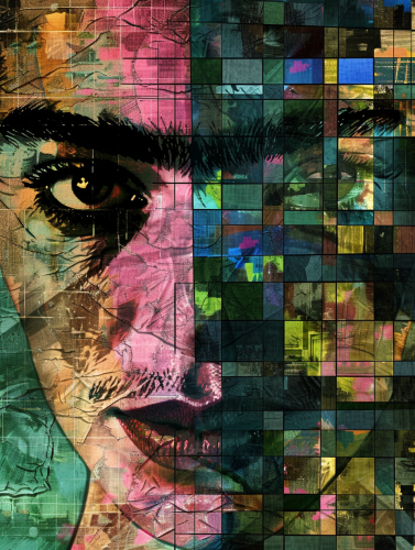 create a bunch of colourful squares thats hide a face, the ones to hide the identity of a person on a picture distorted on a white background, just the squares with no face on it