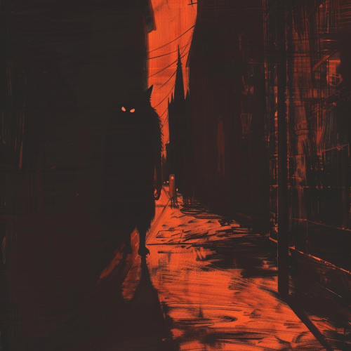 A painted dark illustration of a street at night with the shadow of a bearly visible person that became a monster in the shadow