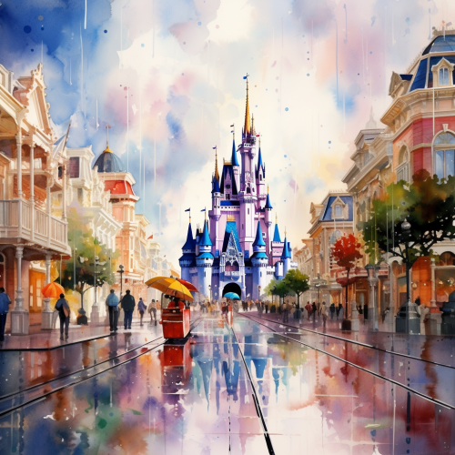 create a stunning watercolor illustration of Disney World. Include disney characters in image. colorful, playful, street view.