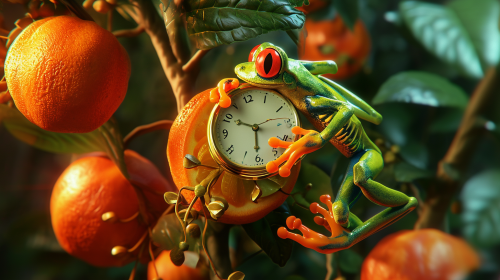 Salvador Dali style frog dipping like clocks on tree, fruitful and colorful, comemrcial lighting, high definition, realistic, --v 6.0 --ar 16:9
