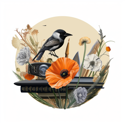circular logo — black and white — transparent background, with the following items in it: a California poppy, a quill pen, planet earth, an open book, a key.