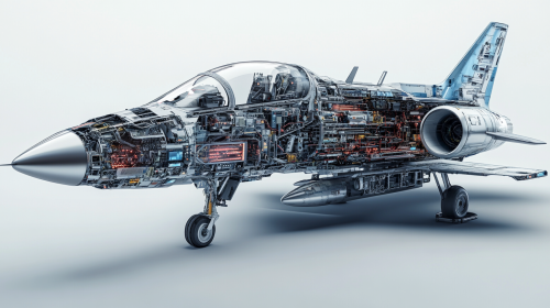 A high-tech realistic diagram showing the insides and how a jet fighter is composed of, octane render, detailed machine technology, 8k details, --ar 16:9