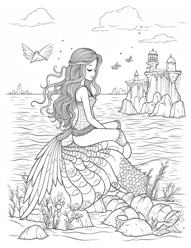 black and white illustration with clear lines, Design a page with a mermaid sitting on a rock, with seashells in the background., carton style, thick line, low detail, vivid color --ar 1:1