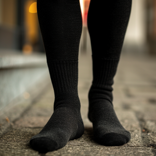 Design a pair of socks entirely covered by the flag design provided. The socks should feature a large red triangle on the left side, with the top half in green and the bottom half in black, replicating the flag's layout. The design should wrap seamlessly around the entire sock, including the foot and calf sections, ensuring the colors--red, green, and black--are vibrant and bold. The socks should have a comfortable fit with clean edges at the cuff and a smooth pattern that enhances both style and wearability.