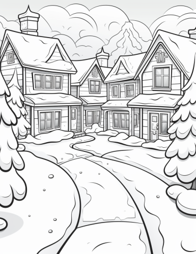 black and white coloring pages for kids, christmas scene with lots of snow, cartoon style, funny, thick lines, --no shading, --ar 85:110