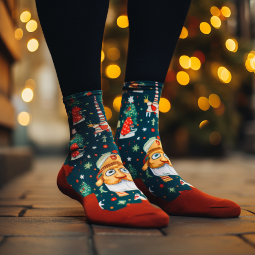beautiful Christmas socks,hanging on the fireplace,play of light and shadow,cozy atmosphere,Christmas time, soft color palette dark green,white and silver