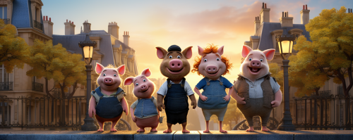 American style cartoon, 5 pigs with an ancient style character image celebrating farewell party,A pair of big eyes, dressed in Jean Basket , with full body front view, high – quality, silhouette light, and a Paris haussmanian style architectural background, highly detailed and full of vitality. Cinematic, stunning,realistic, dramatic, shocking, with a 35mm lens, realistic and warm light, with ray tracing of 8k POP Mart style, Chinese style, super fine, soft focus, oc rendering, 3d, --ar 5:2