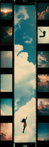 a filmstrip with a sequence of photographic film stills depicting a girl flying up into the sky --ar 3:9 --v 6.0