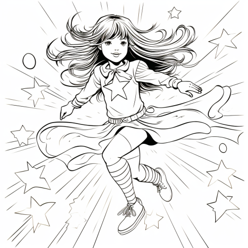 A simple line drawing of a 10 year old girl with long hair and bangs with magical flying powers she is flying like super woman no equipment she is wearing over-alls and may jane sneakers vector file no shading 1980's American style line work drawing