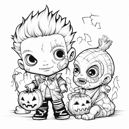 no shading, drawing for children halloween cute baby frankenstein and cute baby zombie and cute baby mummy black and white line art