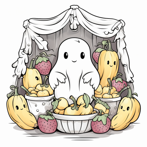 a cute cartoon ghost surrounded by bananas. Black and white Line drawing colouring book style.