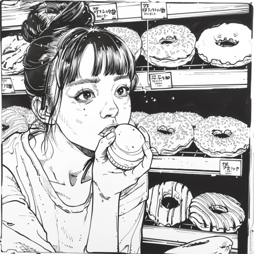 multiple panel comic book, many panels, a line drawing of a woman recording a Tiktok video inside a donut shop, delicious donuts, silly, heavy inked comic book page, detailed link ink, comic book style --v 6.0