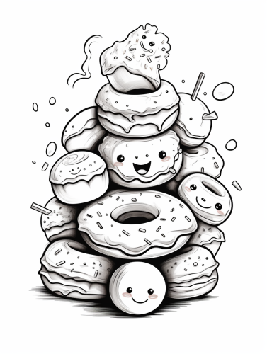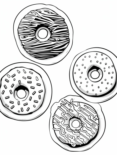 coloring page, cute donuts illustration, doodle style, line art, clean black lines, white background, minimal shading, 4k --ar 3:4