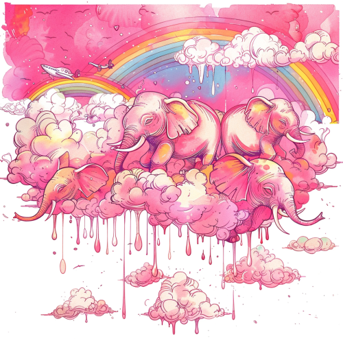 line drawing with water color style, pinks, cute mutant elephants, cute mutant weasel, rainbows clouds